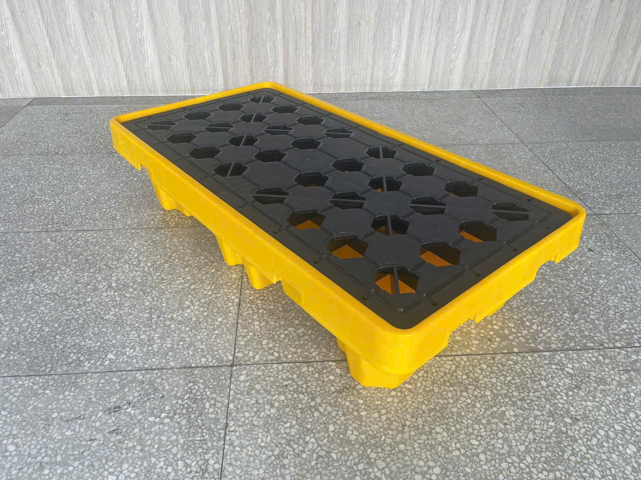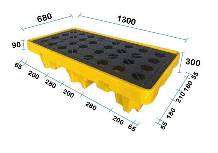 Pallet chống tràn 2 phuy – trọng lượng 17.2kg ±5%, kích thước 680 × 1300 × 300mm ±5%, sản xuất từ nhựa nguyên sinh cao cấp, độ bền vượt trội – giải pháp tối ưu giúp doanh nghiệp kiểm soát tràn đổ hiệu quả, an toàn và tiết kiệm chi phí dài hạn.